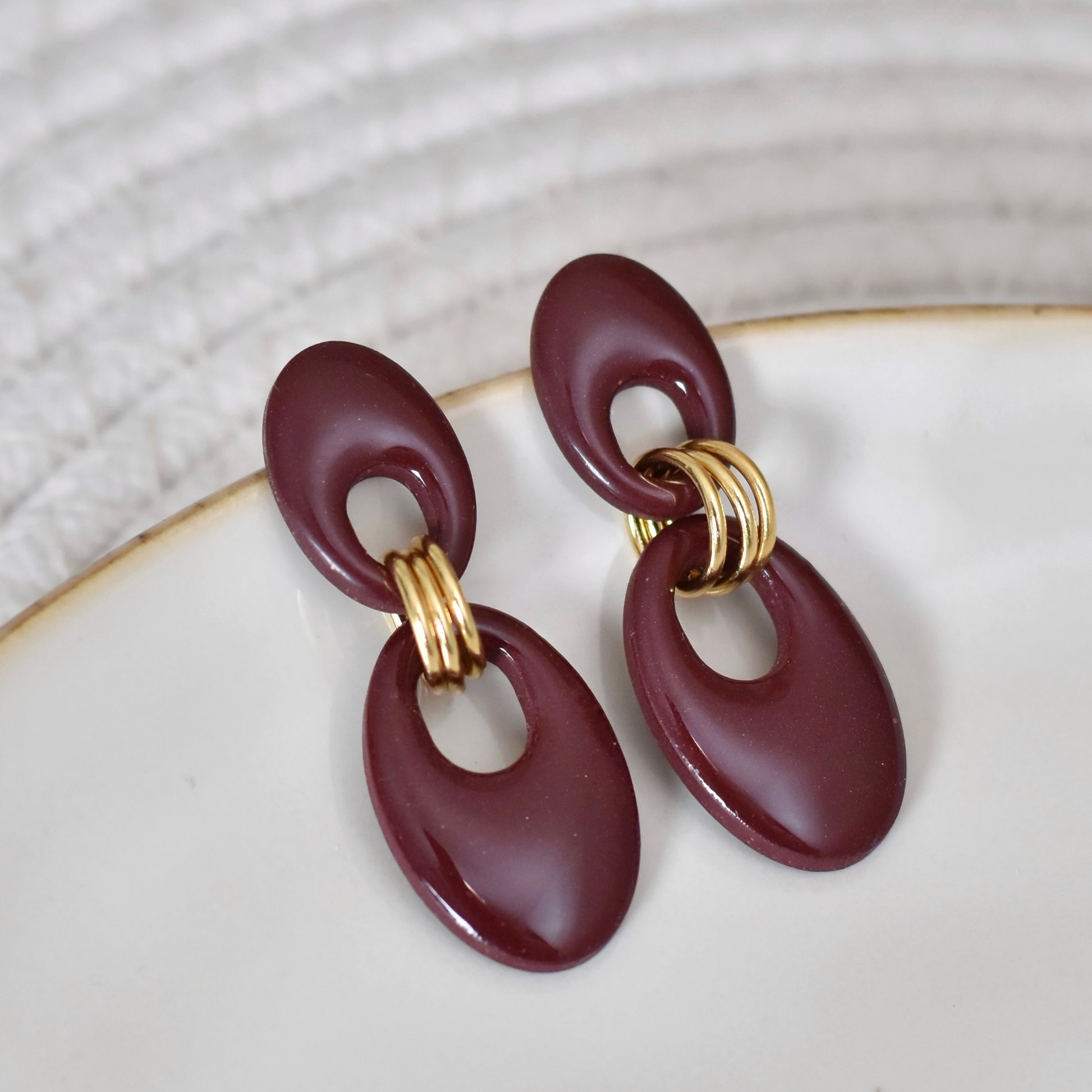 Voeg een vleugje elegantie toe aan je look met deze bordeaux luxe link oorbellen. De diepe wijnrode kleur gecombineerd met de goudkleurige ringdetails geeft deze oorbellen een chique en moderne uitstraling. Perfect voor zowel een feestelijke outfit als een stijlvolle dagelijkse look.