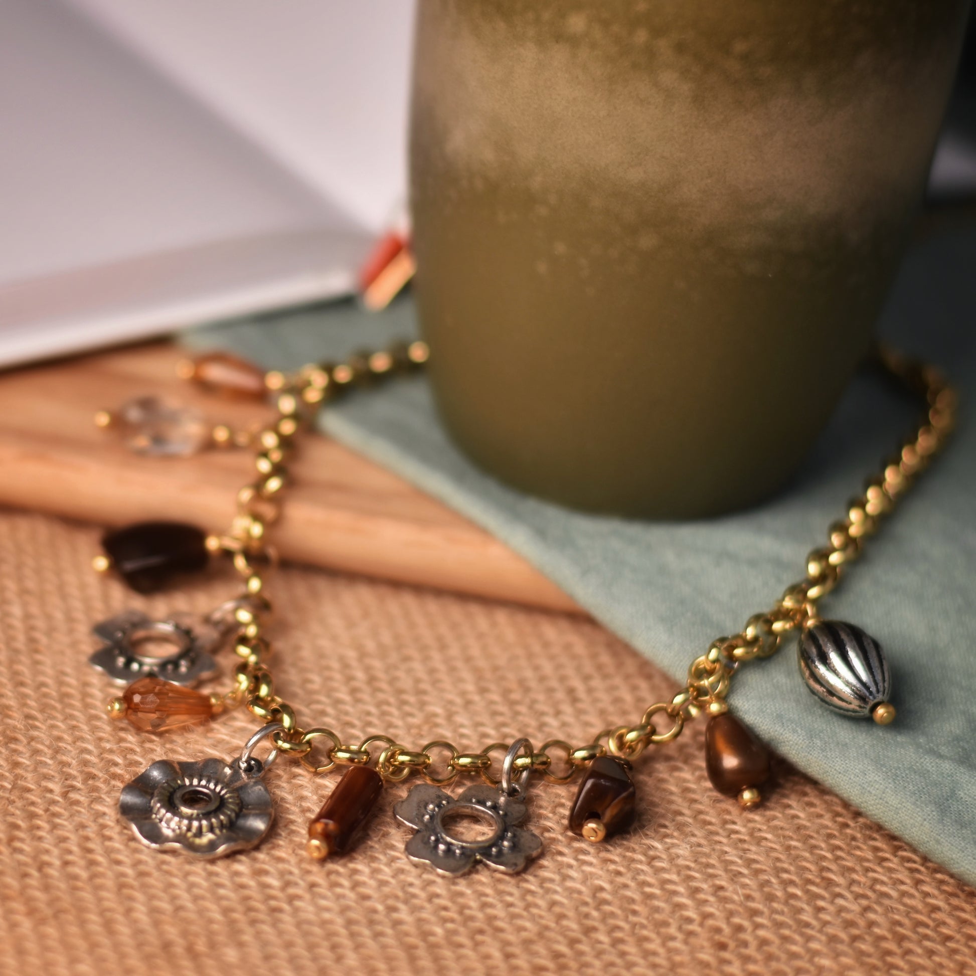 One of a kind! Van deze ketting is er maar 1 en dat zal altijd zo blijven. De ketting is gemaakt van vintage sieraden die een tweede leven hebben gekregen. Dit unieke stuk is gemaakt van verschillende sieraden en bestaat uit verschillende soorten kralen. De basis is een nieuwe ketting van stainless staal, met hieraan 11 vintage bedels van kralen of zilverkleurige bedels.