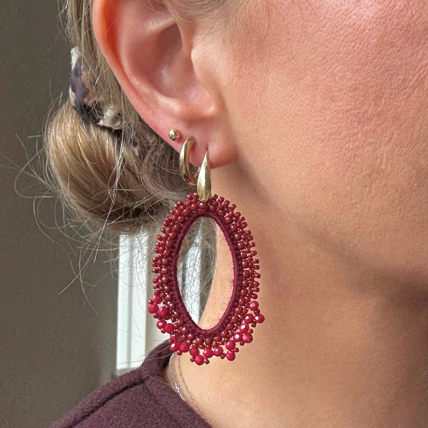 Laat je stralen met de Luna Drops, een paar handgemaakte oorbellen die elegantie en verfijning perfect combineren. De ovale vorm is omrand met kleine glaskraaltjes in het burgundy en afgewerkt met speelse ‘druppeltjes’ aan de onderrand die zacht meebewegen bij elke stap. De goudkleurige stainless steel oorhaakjes geven een luxe touch en zijn gemaakt van rvs, ideaal voor gevoelige oren.